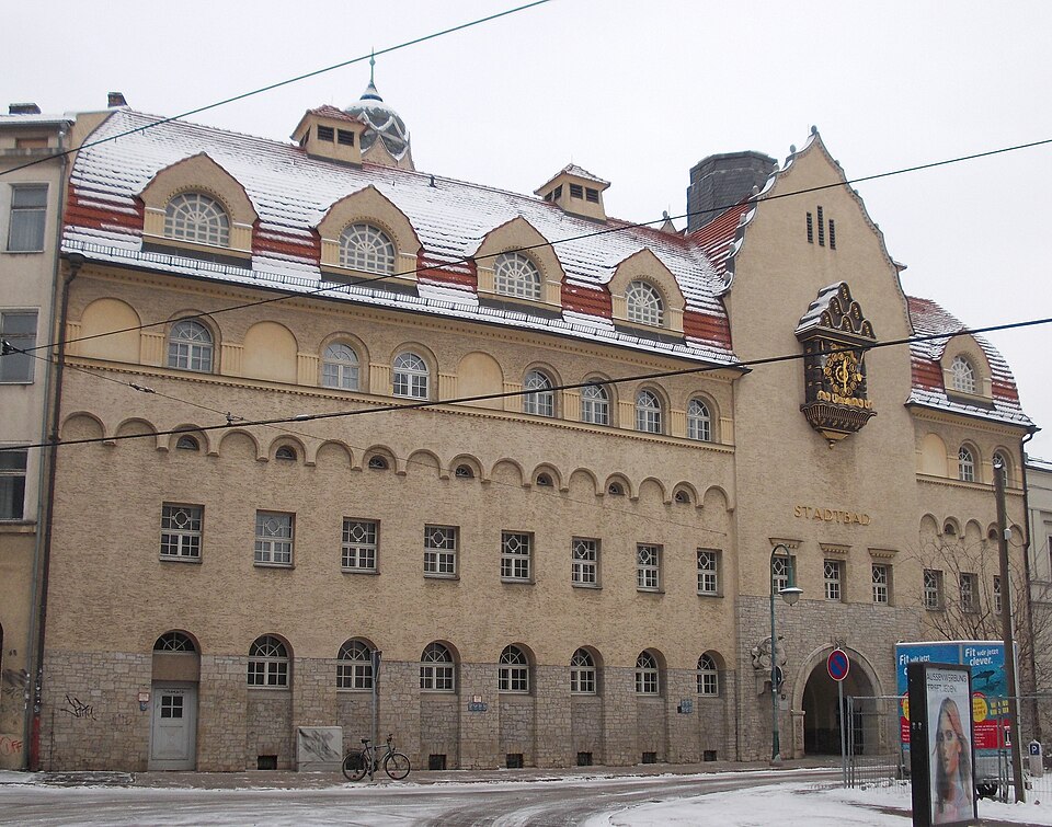 Das städtische Hallenschwimmbad entstand auf dem Gelände der Stadtgärtnerei von 1913-1915 und wurde 1916 eingeweiht und nach Plänen von Stadtbaurat Wilhelm Jost gebaut. Das Tor wird heute noch durch die lebensgroßen Steinbilder einer Nixe und eines Tritons geschützt. Den an der Außenfassade befindlichen hölzernen Uhrerker, entworfen von Martin Knauthe, realisierte der Bildhauer Christian Schmidt. Die Skulpturen „Fischmann“ & „Fischweib“ auf dem Vordach zur Eingangshalle stammen vom Bildhauer Paul Horn. Die sich zu beiden Seiten des Eingangsportals befindlichen Meeresplastiken sind Werke des Bildhauers Christian Schmidt. Zudem gibt es reichlich keramischen Dekor im Inneren.
